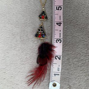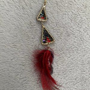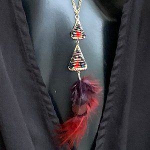 A reddish and dark brown (with black tipped) feather hangs from the lower triangle.