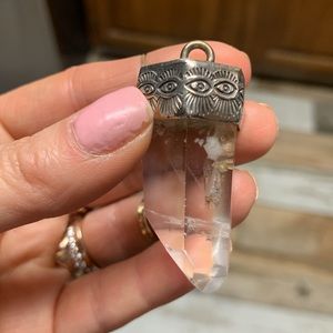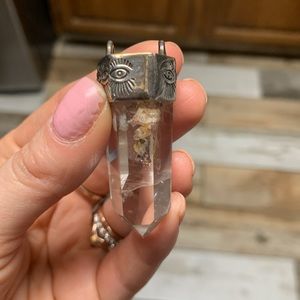 Huge Sterling Silver Numi Olive Talisman. No chain, and I’m not sure on the crystal as I purchased second-hand. Eyes stamped around the top, some GORGEOUS natural inclusions, but the stone itself is near-perfect. Some slight tarnishing as pictured. Pendant measures 1 inch thick at the widest point of the bail/top, and 1.75 inches from the the top of the bail to the tip of the crystal.