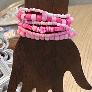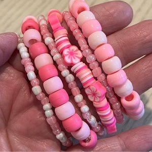 Pink beaded bracelets handmade stretchy stackable floral glass plastic and resin beads. Mix and match. 6 strands. Pink and white. Women teens girls.. brand new