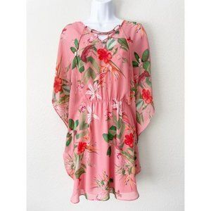 Great pre-owned condition. Pink floral chiffon overlay with attached lining. Cinched waist. Tie up V-neck. Dolman sleeves.