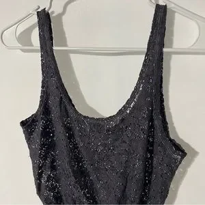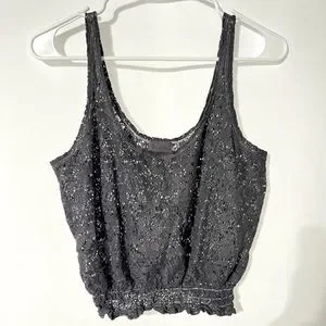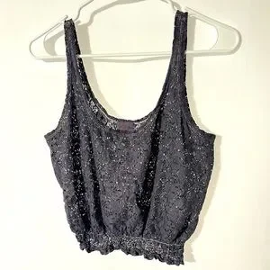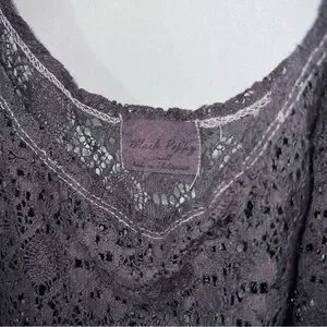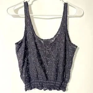 Black Poppy size small women’s crop tank top. See through lace bohemian style. This top is great to wear with a cute bralette or to use over your swimsuit. Easy breathable and fashionable summer tank. The color is a dusty grey/purple! The purple is least dominant and shows best in the sun.