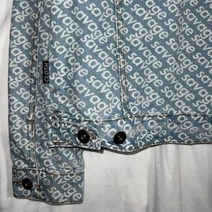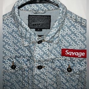The statement jacket you’ve been looking for. SAVAGE print throughout with embroidered red and white patch. Great heavy jean jacket for layering and staying cozy yet fashionable this Fall. 🍁