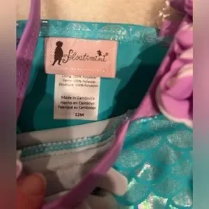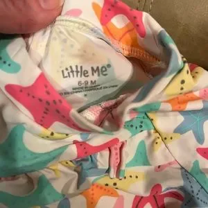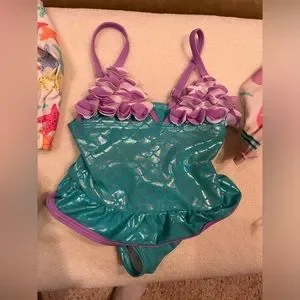 3 bathing suits - from left to right: 6-9 months little me 2 piece suit, middle is size and 12 months, 3rd one is Ruffle Butts 6-12 months