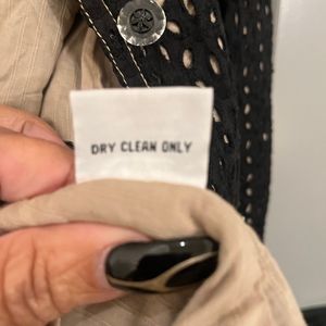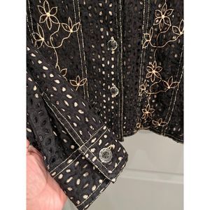 A Yak Magik Eyelet Embroidered Jacket, black jacket with tan lining and tiny sequins in a size small. It has a vintage style and is suitable for casual occasions or workwear. The jacket is mid-length with long sleeves and a button closure.