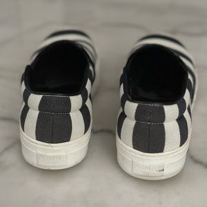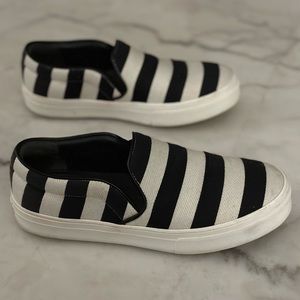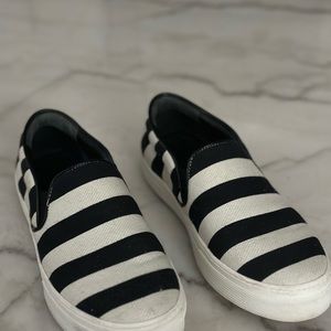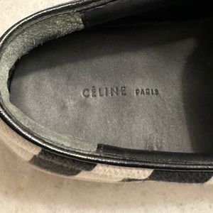 Celine slip on sneakers. Beautiful black and white white stripe sneakers. Gently used, maybe worn 10 times. I love these shoes, but they’ve been sitting on my shelf for about five years. They need someone to love them. They are very comfortable and very stylish.