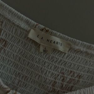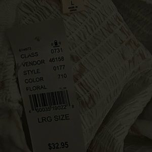 White top with brown flowers and tie in front that lays on shoulders, size L from Pacsun. It’s never been worn and still has the tag on it. Materials are 100% rayon on the entire blouse and 100% polyester on the lining of it.