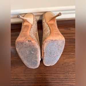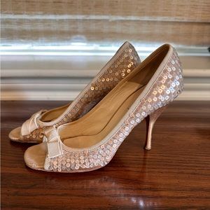 PRADA sequin peep toe pumps with silk heel in a neutral peachy warm ivory beige. 36.5, but I would say fits more like a US 6 (EU 36) since Prada heels tend to run a half size small.