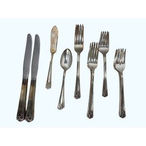 This vintage April Silverplate International Silver Flatware from the 1950s is perfect for an elegant and timeless dining experience. Crafted from silverplate, the set includes over 18 pieces, including knives, forks, and spoons. REPLACWMENT