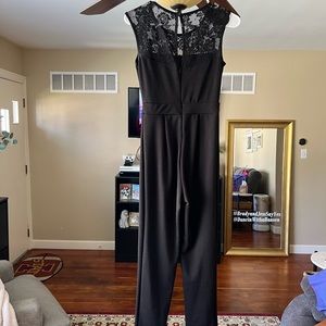 Black jumpsuit. Gently used. A few spots with small pilling. There is an up close picture of what I mean and this is the main spot. Not noticeable unless you’re right on top of the affected area. The rest of the garment is in good condition. Lightweight fabric, not heavy but also not see through at all, lace sleeve detail is in fact with no tears or issues. Button top closure and partial zipper closure, slim tapered leg fit. Size XS fits TTS