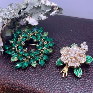 Green Rhinestone Spring Wreath Brooch and Green and Pearl Golden Flower Pin