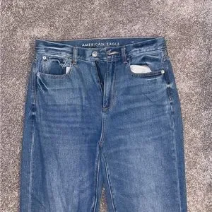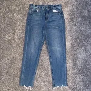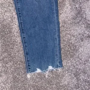only worn a handful of times, in great condition, medium wash, mom jean style, distressed hem, zip closure, belt loops and front & back pockets, high waisted, more relaxed fit, women’s US 6
