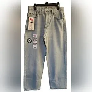 Up for sale is a pair of Wrangler Five Star Loose Jeans in Boys Size 14 with an adjustable waist. The jeans come in a light wash with a classic, straight leg style. The zipper and top button closure make them perfect for casual occasions, and the denim fabric wash adds to their appeal.