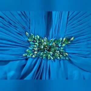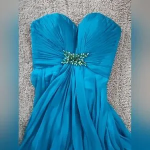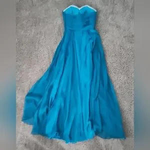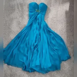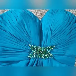 turquoise strapless beaded prom formal gown. has spaghetti straps in bag detachable. does not appear to have been worn