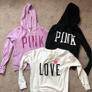 3 Small Victoria Secret hoodies/sweatshirts. 2 PINK VS hoodies & 1 VS sweatshirt