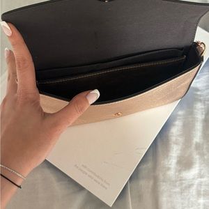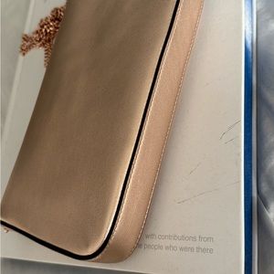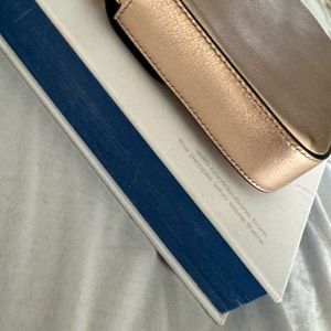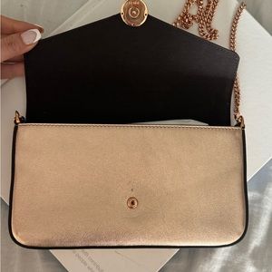 This is an authentic FENDI Laminated Calfskin F is Fendi Envelope Wallet on Chain in Rame. This mini bag is crafted of calfskin leather in metallic pink. The bag features a removable waist-length rose gold chain-link shoulder strap and a facing flap with a matching gold Fendi F ring logo. This opens to a dark brown tabric interior with a patch pocket and one removable insert.