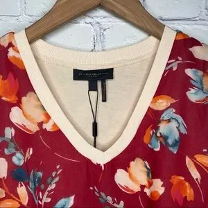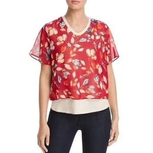 Beige cotton t-shirt with attached red chiffon floral overlay