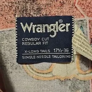 Wrangler X Long Tails Shirt. Cowboy cut regular fit. 17.5 x 36. Measures 24 inches pit to pit, 25.5 inch sleeves. Made in USA, 100% Cotton. Beautiful color and design! Great shape!