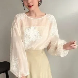 Embroidered floral print semi sheer puff sleeve blouse
