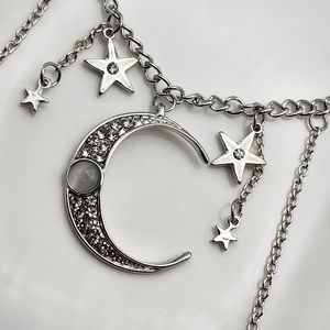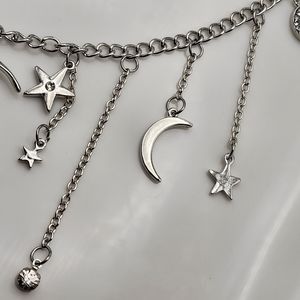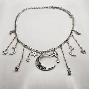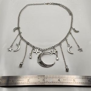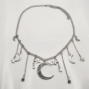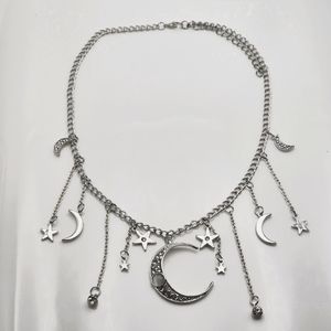 Stainless steel necklace with dangling moon and star accents.