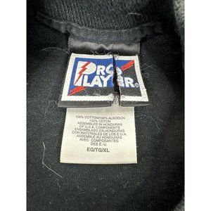 This vintage Pro Player T-shirt features a black color with a graphic print of Carlos Santana. Made of 100% cotton material, it has short sleeves and a crew neck. This T-shirt is in regular fit and XL size. Its accents include the logo of the brand, and it's a double-sided shirt. This men's T-shirt is perfect for music lovers and those who appreciate the 90s theme.