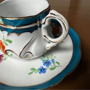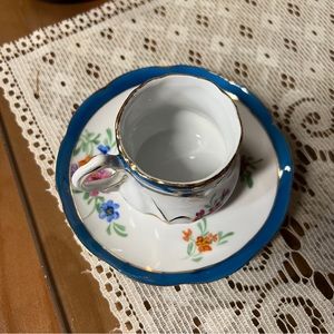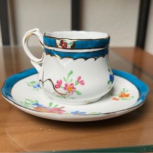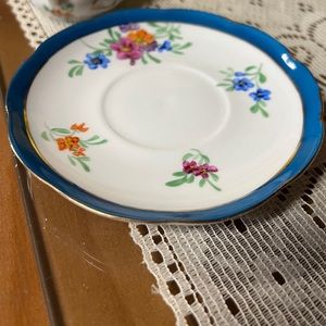 Limoges China White Floral Teacup & Saucer Gold Scroll England Blue Border Vtg
