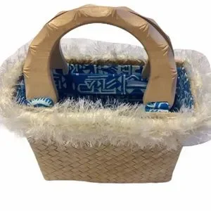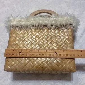 Use this stylish bag to a date, girls night out, or any special occasion! This woven lauhala tote bag features a blue and white fabric inner lining and a full length zipper. The outside is lined with white eyelash yarn and sturdy handles.