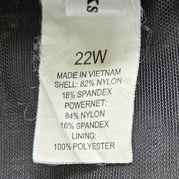 Studio works black and white one piece bathing suit. 22w. There was something on it, so I washed it, and some residue was left where the panty liner goes from the tape. Doesn't affect use.