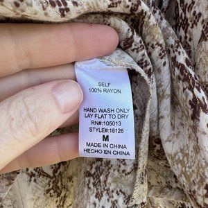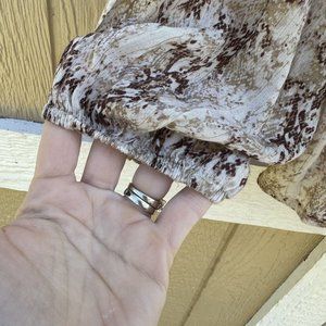 Very good condition. No holes or stains. Semi-sheer. 100% rayon. Elastic at end of sleeves.