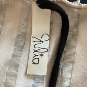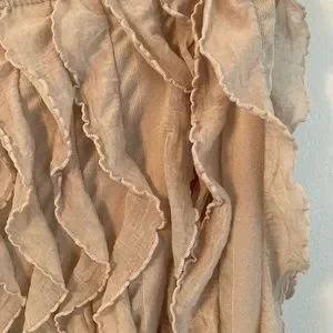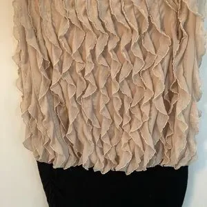 Beige frills over a black ruched bodice. Bodice gives slimming effect. Wear under blazer or suit for bohemian look or pair with black slacks for classic look.