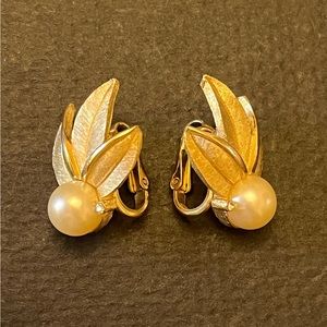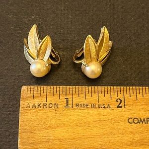 Vintage 1960s Crown Trifari clip on earrings. Leaf design with Faux Pearl and rhinestones. Good vintage condition.