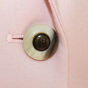 It features a slanted welt chest pocket, streamlined jetted front pockets and classic notched lapels. The single button closure creates a refined and feminine look. The button itself is beautiful, with a horn texture at the outside and an exquisite embossed crest at the center in bronze metal. It is fully lined in a silky acetate that sports a lovely woven diamond pattern. The sleeves have a single button each (matching the custom button in front). The back is ventless in true 80s fashion. And let's talk about the glorious color for a moment: a heavenly blush pink that will elevate any outfit and is perfect for springtime dressing! More info in comments!