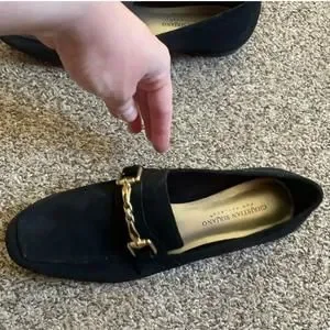 These Christian Siriano black suede loafers are the perfect addition to any wardrobe. They feature a sleek and sophisticated design, with a gold-tone buckle and a comfortable 1-inch heel. The loafers are in excellent condition and have only been worn a few times. They are perfect for a day out or a night on the town.