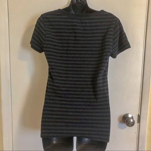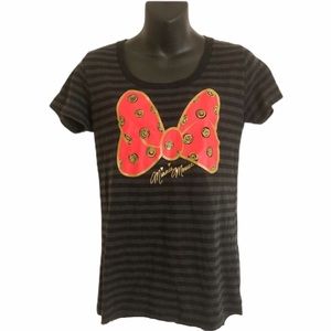 Wear this stylish top to any casual gathering or to a trip to Disneyland or Disneyworld! This black and gray striped top features Minnie Mouse’s signature and her red bow with gold swirls . Pair with your favorite jeans, leggings, skirt, or shorts. Perfect for you Disneyland or Disneyworld vacation!