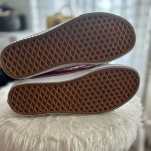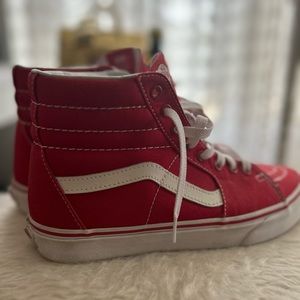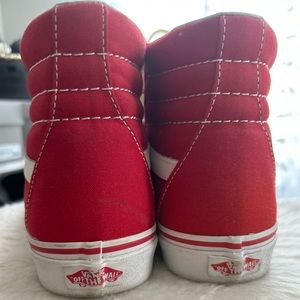 Woman’s Vans high top red sneakers! Worn 3 times!! Still in good condition and can be cleaned on the soles easily to remove the light spots. Very good condition! Smoke free home!