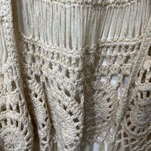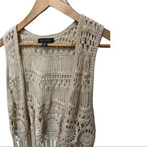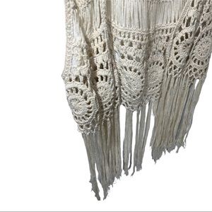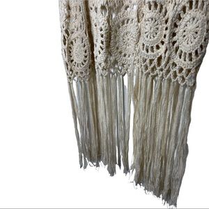 KENDALL AND KYLIE IVORY CREAM BOHO CROCHET FRINGED SLEEVELESS VEST SIZE MEDIUM/LARGE. SUPER ON TREND CROCHET OPEN STYLE SLEEVELESS VEST WITH LONG FRINGED TRIM. GREAT TO LAYER AND WEAR WITH JEANS! GREAT CONDITION.