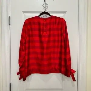 Monochrome red striped top features bow detail on sleeves and buttons on back. Perfect for Christmas, Valentine’s Day, or wearing to work at the office. Size M. Excellent Preowned Condition. 100% Polyester.