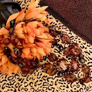 Beautiful brown necklace, 2 rows of multi shaped brown translucent beads along a gun metal color chain with lobster claw clasp.