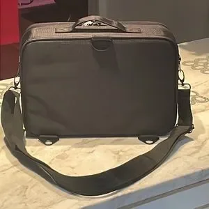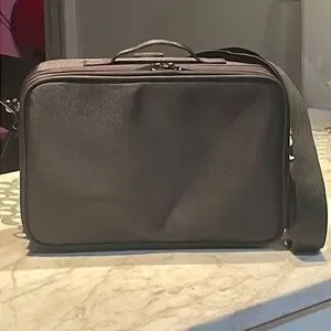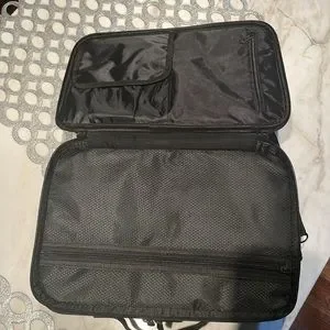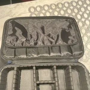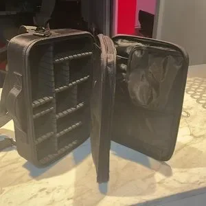 Large, double zipper compartment, three layer, customizable, rigid makeup storage case.