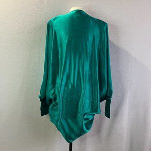 Butterfly shaped jacket is tapered to rounded shape at bottom. Big shoulder pads. Raglan sleeves with long button-close cuffs.