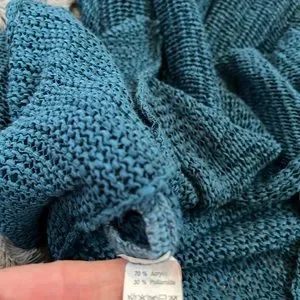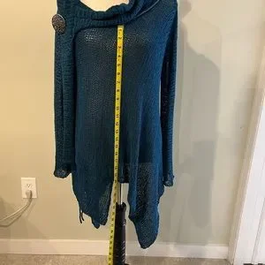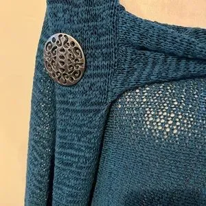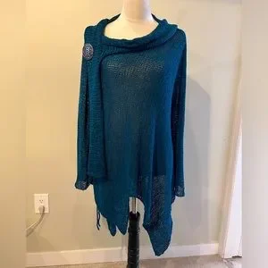 Has crocheted look; sheer material; bell sleeves; comes with brooch; cowl neck front with faux scarf