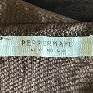 Peppermayo Marseille Brown Mini Dress. Tie back and neck, center ring detail and hidden side zipper. Size 6. Top is hard to measure because of ties- dress will adjust to fit many chest sizes. Laying flat approximate bottom measurements are 13.5" waist and 20" length (from the center ring). Excellent condition!