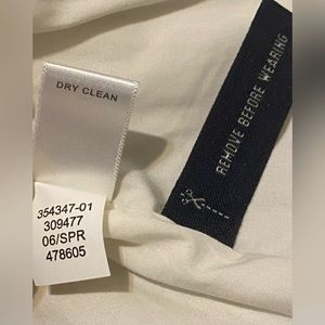 Size 2P, Banana Republic, white with blue/grey stripe collared coat blazer, lined, built-in shoulder padding, button closure front pockets, pleated back, shell 76% cotton & 24% linen, body lining 100% cotton, sleeve lining 100% acetate