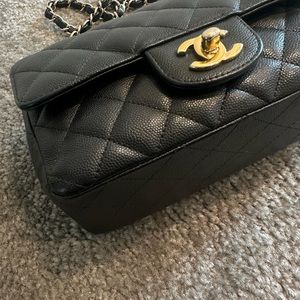 100% Authentic Chanel Rectangular Mini Black Caviar from year 2017 good used condition. photos show the flaws. one corner scuff. inside some wear the top flap inside has a little wrinkle. hard wear faded slightly everything else looks great still functional and flaws barely noticeable. comes with dust bag and box and card.