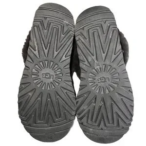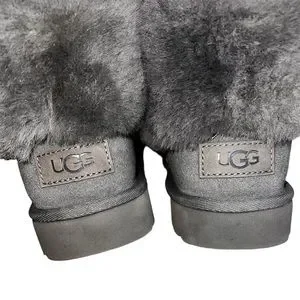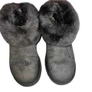 UGG CLASSIC MINI FLUFF BOOTIE. A plush, short shaft of fluffy genuine shearling on a cozy boot—a fan-favorite updated with a modern look. Toe style: closed toe 4" shaft Pull-on style Treadlite by UGG™ sole Genuine shearling and leather upper and lining/synthetic sole. Color: charcoal gray. The shearling lining, fluff collar, and sole are in like new condition. The suede outside needs a good cleaning. See photos for marks and stains. A good cobbler or some elbow grease could get these back in pristine condition! Make me an offer.