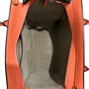 *top zipper opens to an orange suede leather interior with a patched pocket