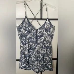 Xhilaration 100% Rayon Blue & White Floral Romper With Adjustable Spaghetti Straps That Criss Cross In Back. Elastic Waist. P2P 21 Inches