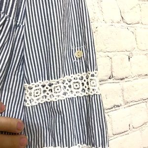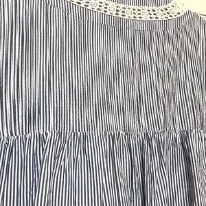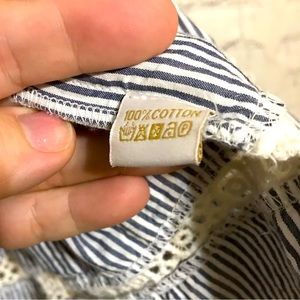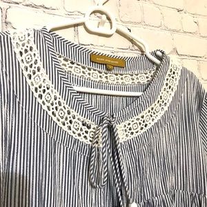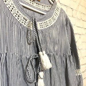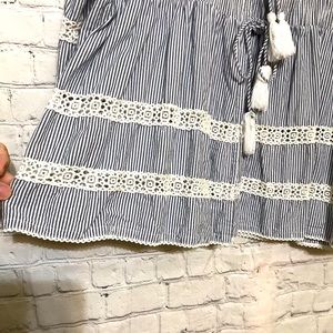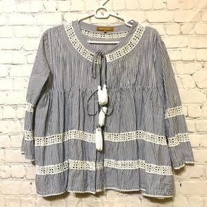 NWOT high-end designer blouse featuring double tassel tie front, ruffled bodice and knit lace details. Navy and white stripes with 3/4 length sleeve. Add a touch of whimsy to your next vacation.