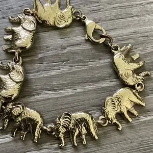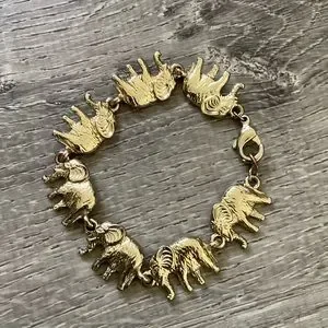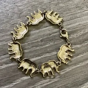 For sale is a preowned goldtone plated brass bracelet with elephant linked throughout. It has been worn and has some tarnishing at the clasp and links between the elephants. See photos for details. Measures 7 inches from end to end including the clasp.