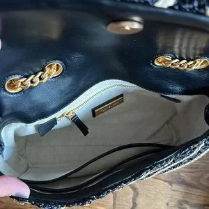 @jodiehawley neither. it's just the way it photographs. it's in excellent condition. the logo is half weaved into the material of the purse. it's the style of the bag