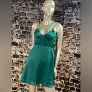 Teal green short strappy formal dress. Shoulder straps are adjustable with stretch ruching in the back and a built in lining/slip layer.